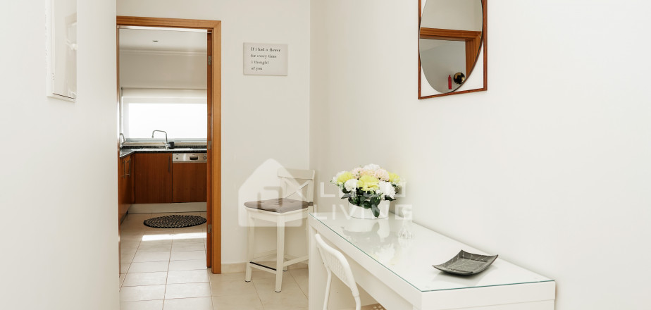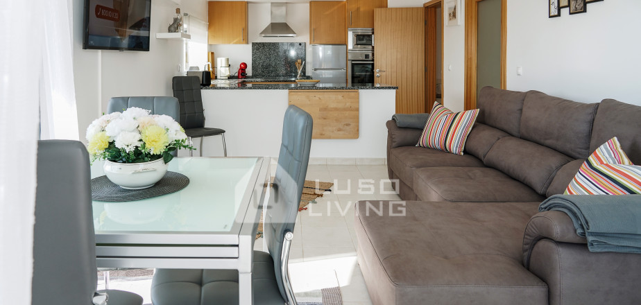 A cozinha está em plano aberto com a sala de estar/jantar, com grandes janelas de vidro que dão acesso a uma varanda com uma fantástica vista para o mar, piscina e jardins, onde poderá tomar o pequeno almoço ou assistir ao pôr do sol. A sala tem ar condicionado para o seu conforto, uma TV de grandes polegadas com canais portugueses e estrangeiros, assim como ligação à internet, Wi-Fi (sem custos adicionais).