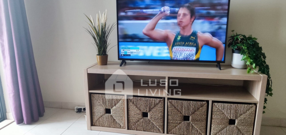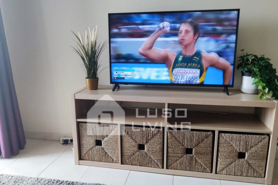 A ampla varanda, acessível através da sala e do quarto, tem mesa e cadeiras para que possa desfrutar das suas refeições com vista para a zona ajardinada em redor do condomínio.